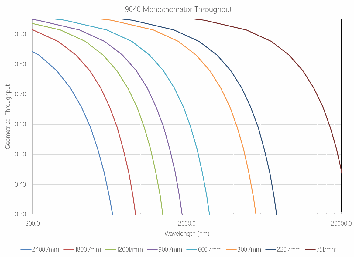 Ruled gratings may be blazed to increase their efficiency over a specific wavelength band. Holographic gratings can be modulated such that they are more efficient at some wavelengths then at others. Grating efficiency curves are the best tool for determining the most efficient grating available for your application. It is important to note that grating efficiency curves do not represent the exact efficiency that should be expected when the grating is used in a monochromator as grating efficiency curves are taken at Littrow angle.